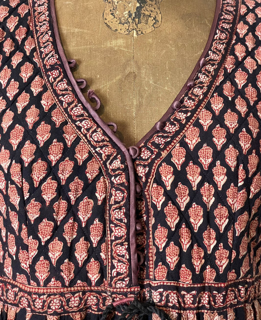 Vtg Anorai Indian Block Print Burgundy Midi Dress - XS