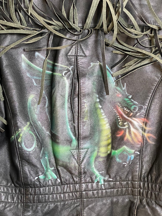 '80s Vintage Black Leather Fringe Dragon Moto Jacket - MED