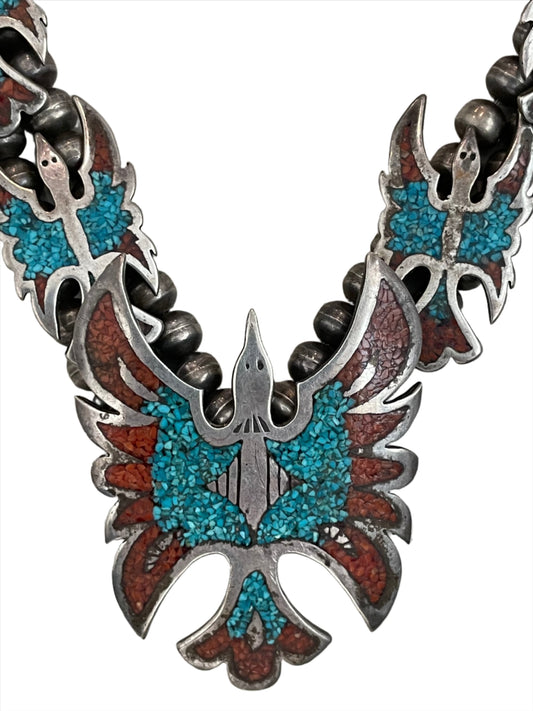 Vintage Thunderbird Squash Blossom w/Turquoise & Coral Inlay Necklace