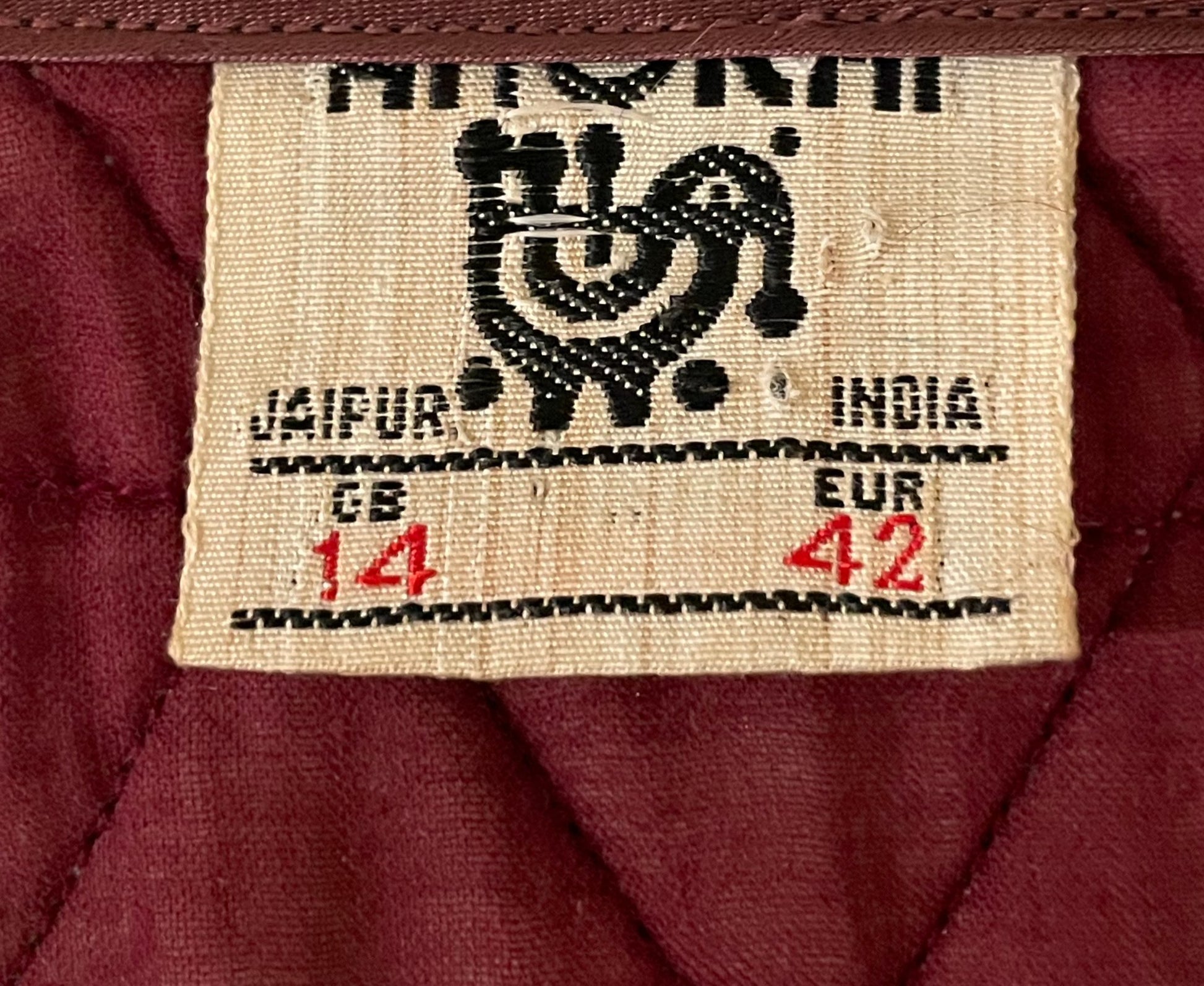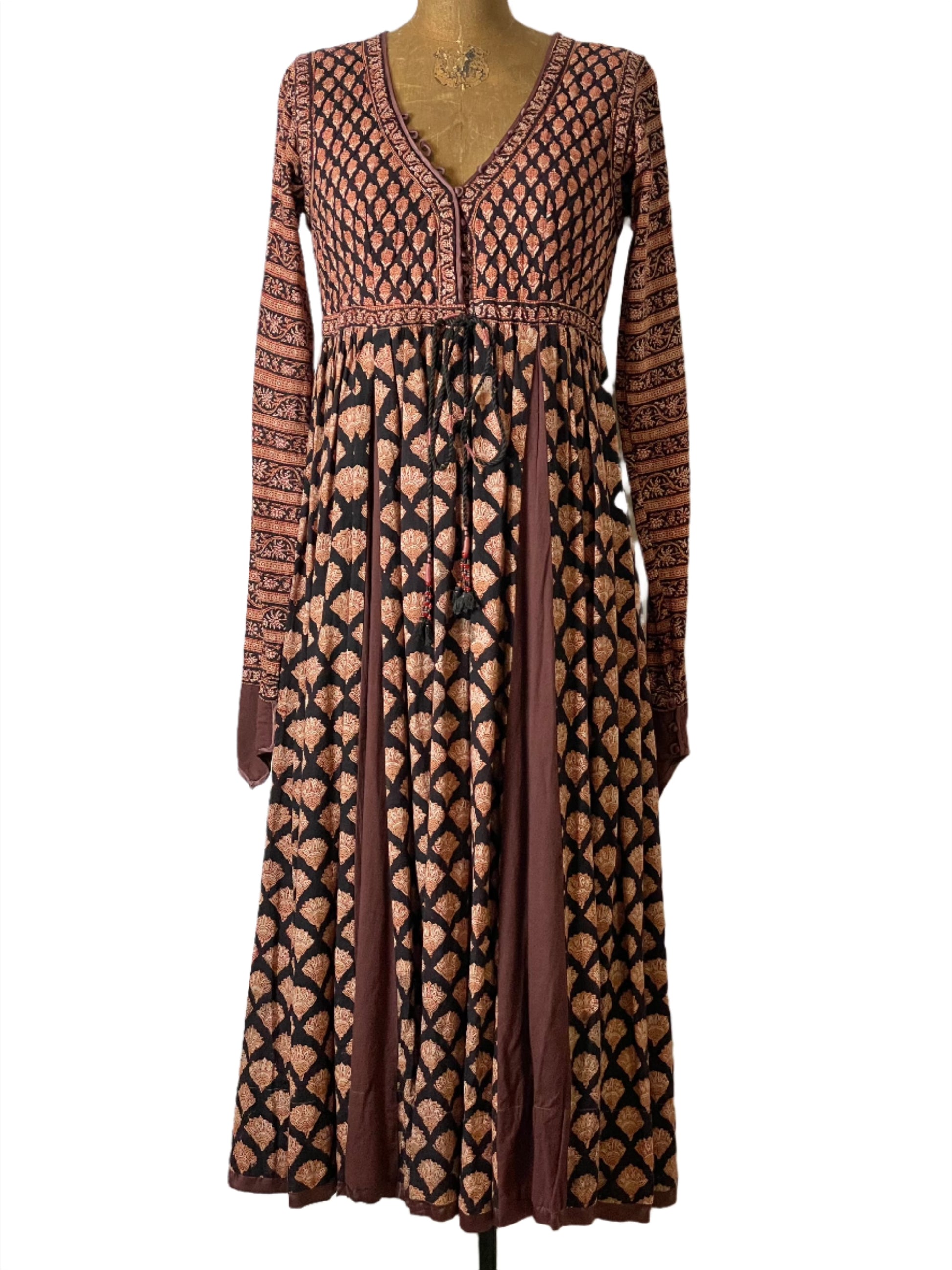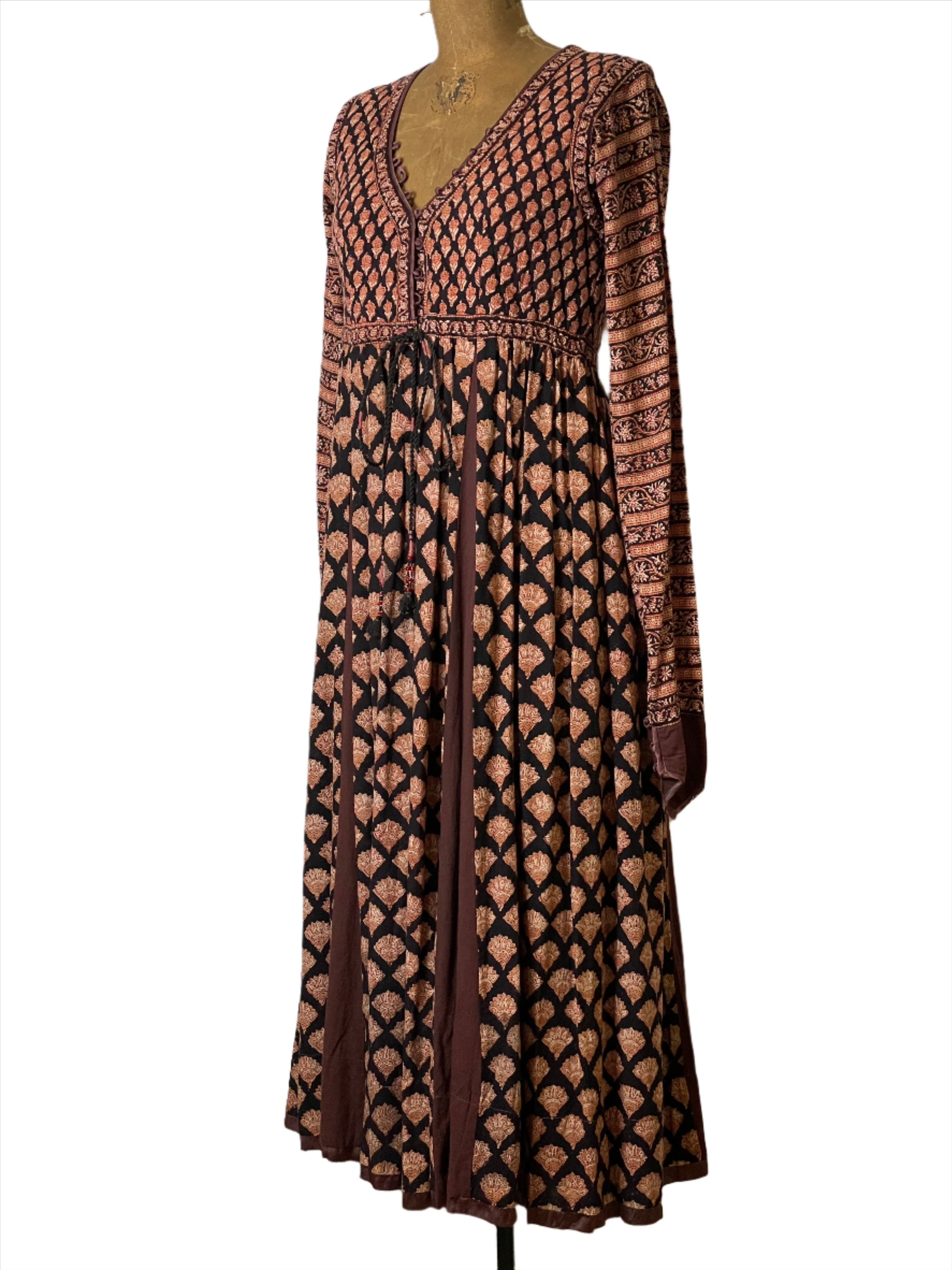 Vtg Anorai Indian Block Print Burgundy Midi Dress - XS