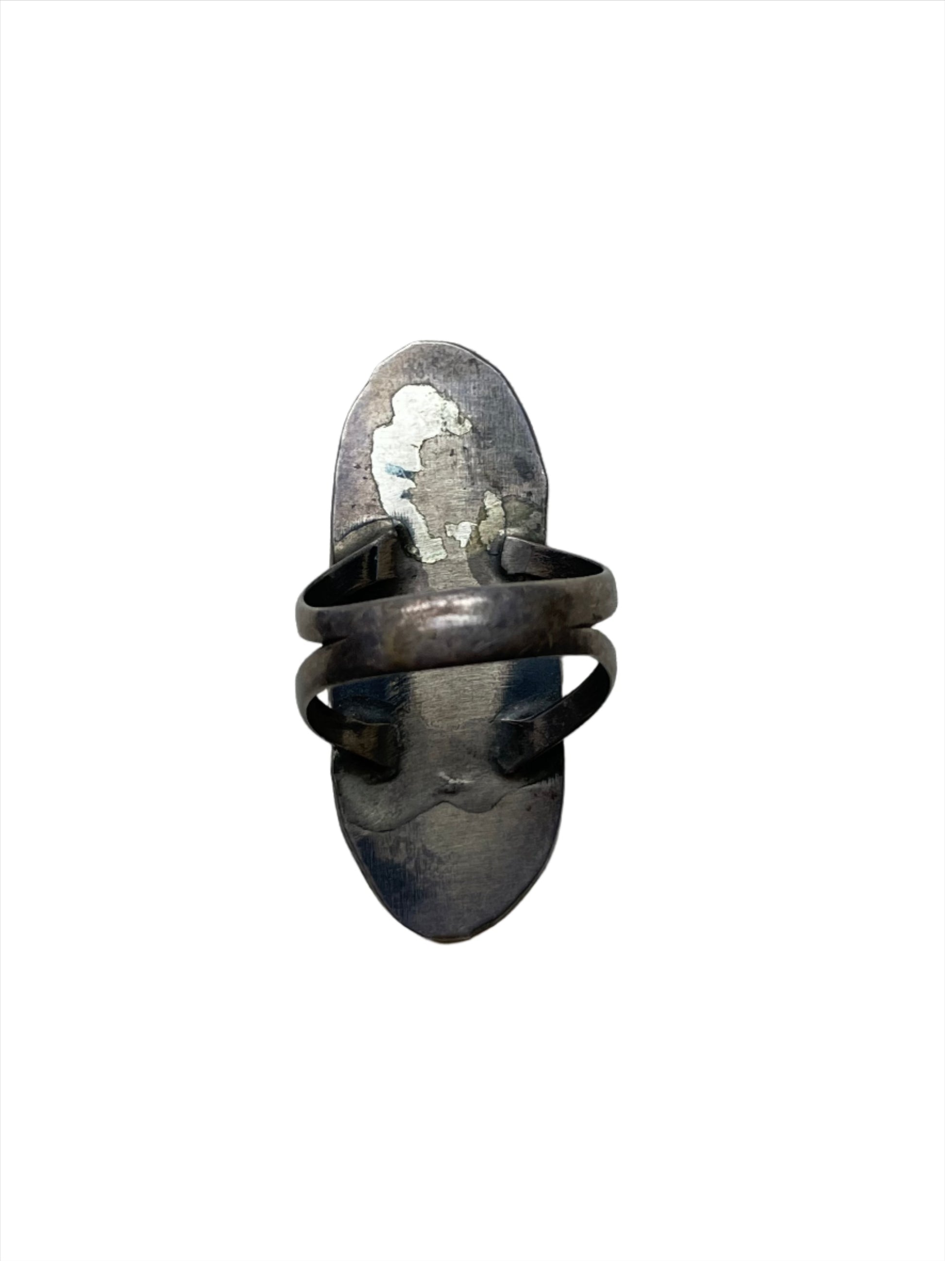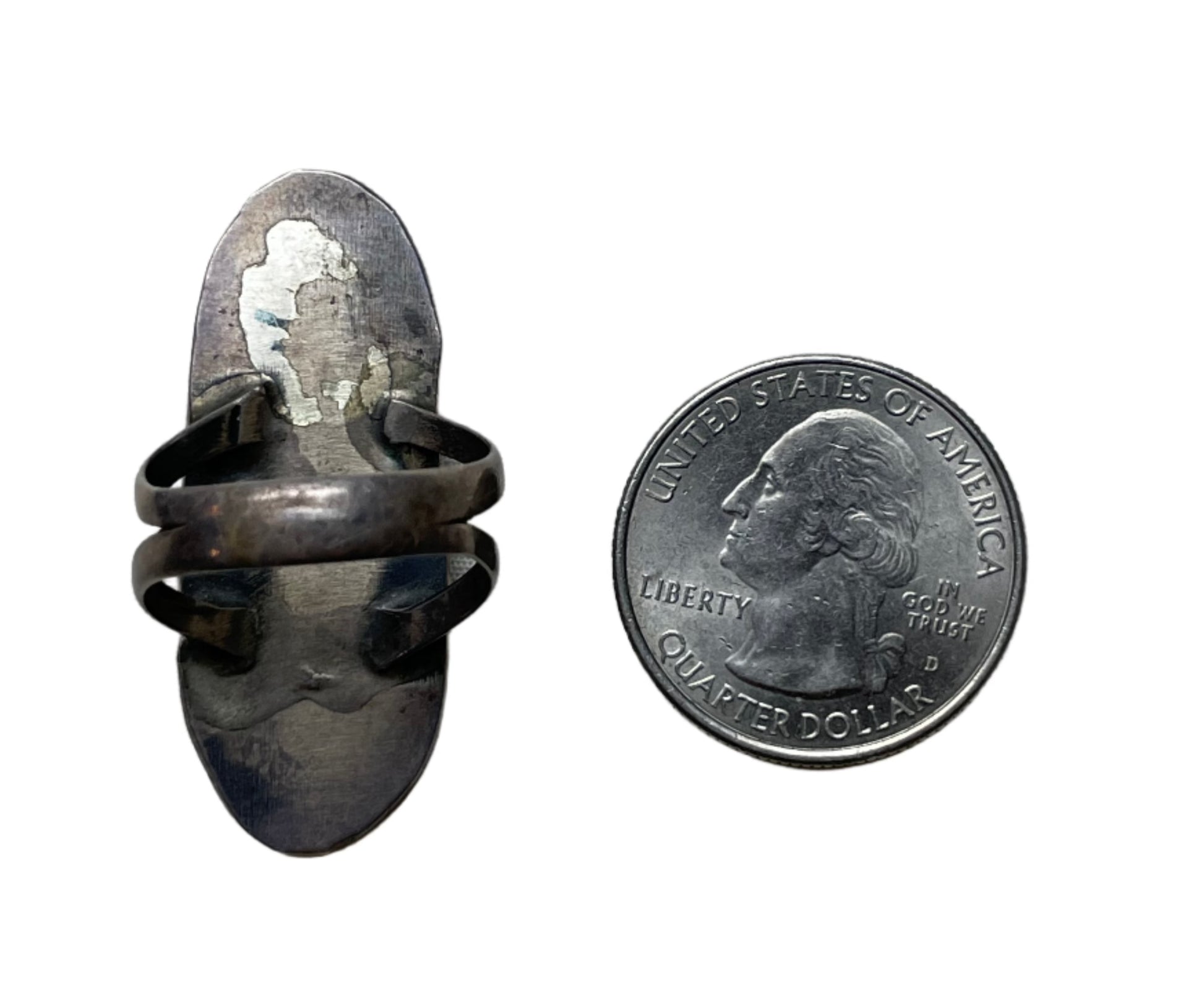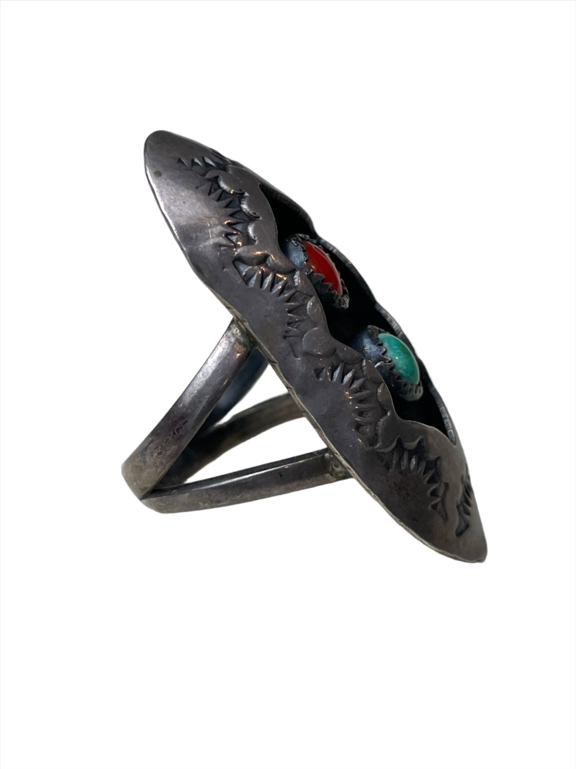Vtg Oval Turquoise & Coral Shadow Box Ring w/Etching Sz 6 1/2